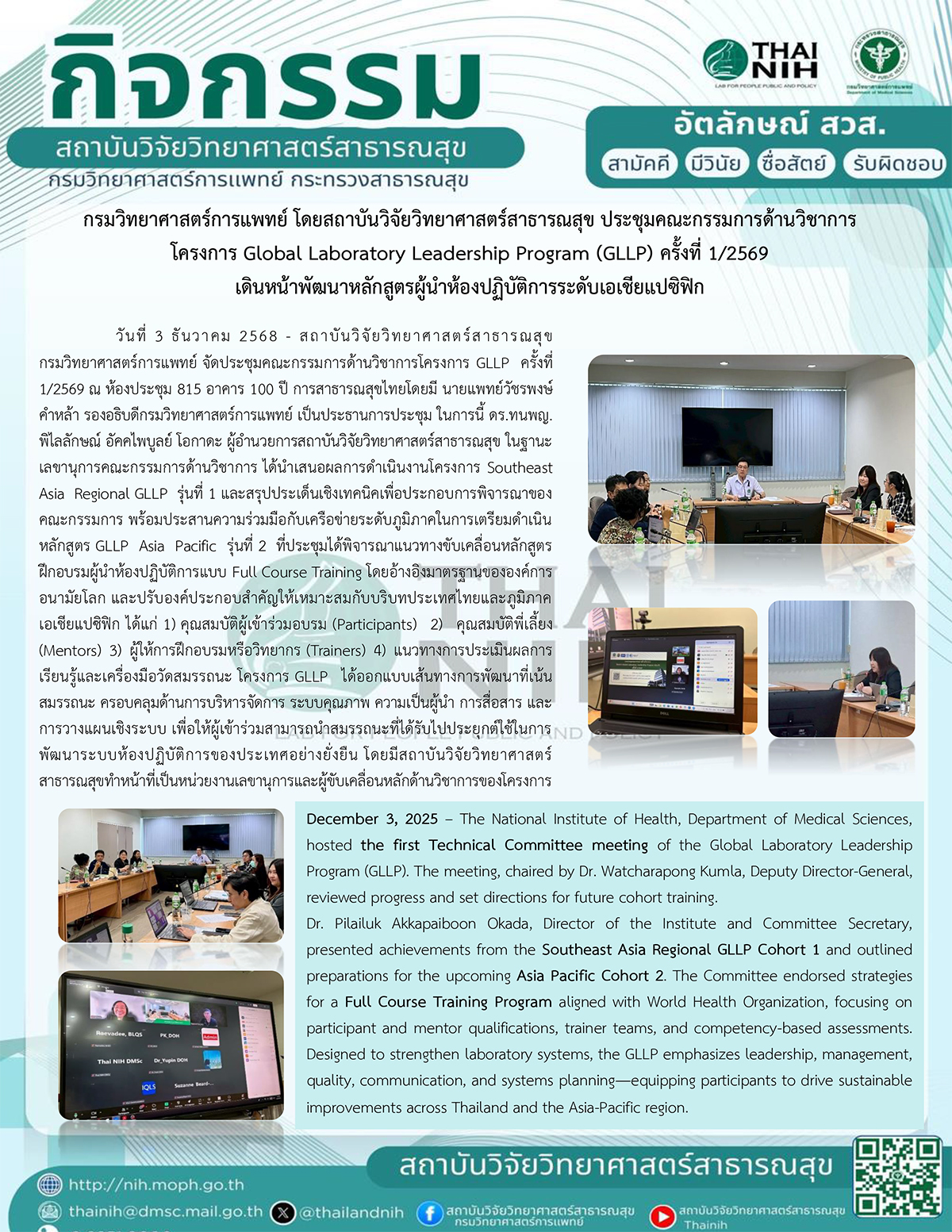 กรมวิทยาศาสตร์การแพทย์ โดยสถาบันวิจัยวิทยาศาสตร์สาธารณสุข ประชุมคณะกรรมการด้านวิชาการ โครงการ Global Laboratory Leadership Program (GLLP) ครั้งที่ 1/2569 เดินหน้าพัฒนาหลักสูตรผู้นำห้องปฏิบัติการระดับเอเชียแปซิฟิก
