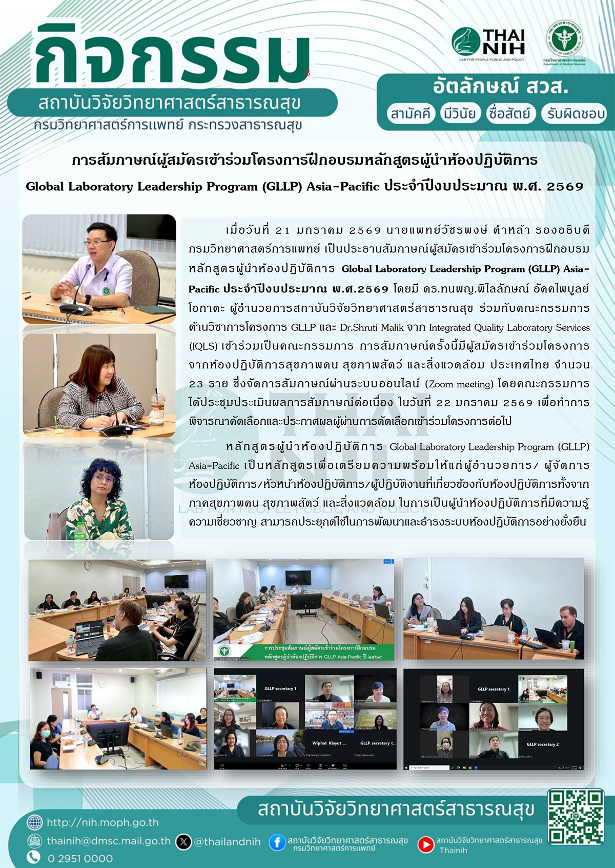 การสัมภาษณ์ผู้สมัครเข้าร่วมโครงการฝึกอบรมหลักสูตรผู้นำห้องปฏิบัติการ Global Laboratory Leadership Program (GLLP) Asia-Pacific ประจำปีงบประมาณ พ.ศ. 2569